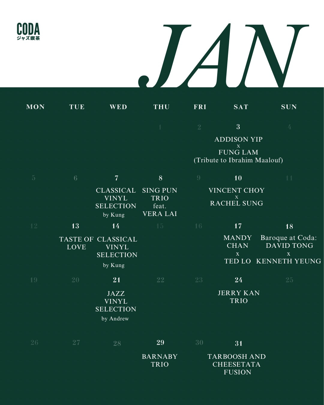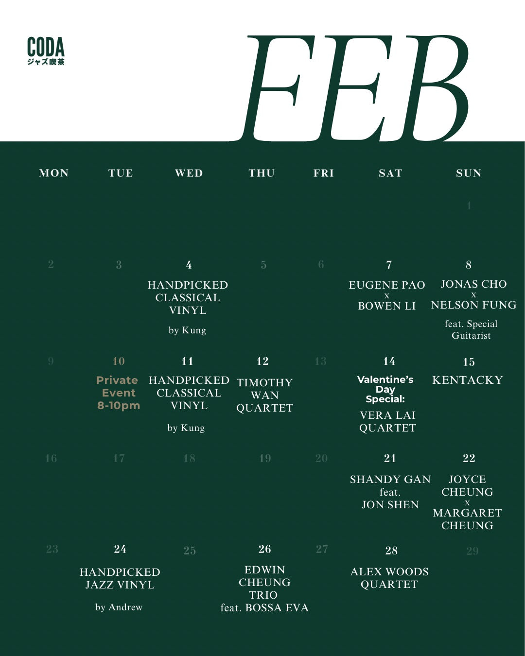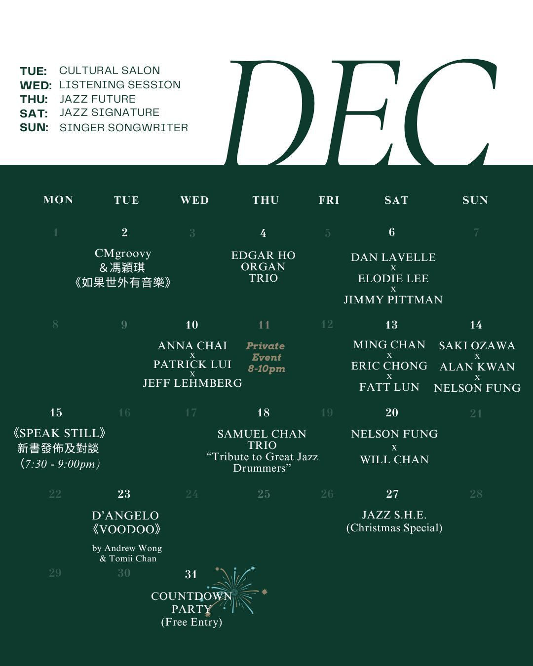我們有不同類型的活動,包括每逢星期六的爵士樂表演系列【 Jazz Signature 】、星期二的【 文化沙龍 Cultural Salon 】、星期三或四的【 Listening Session 】、星期四的【 Jazz Future 】,星期日的【 Singer Songwriter 】。