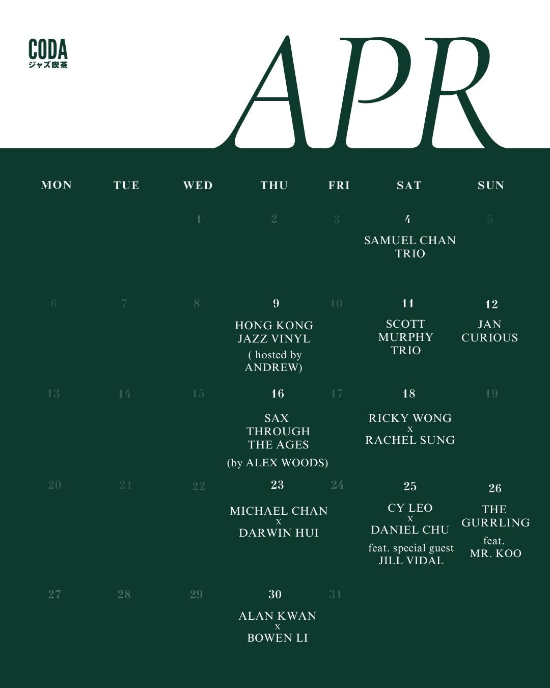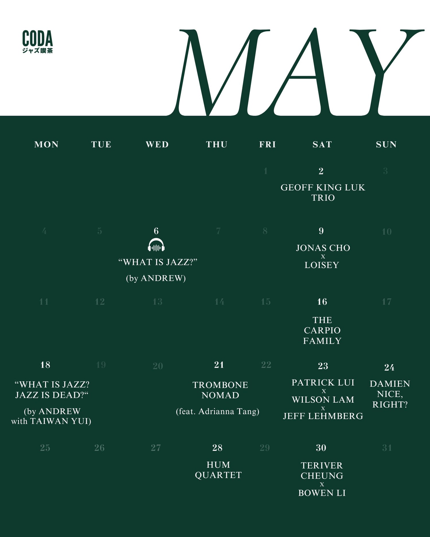 我們有不同類型的活動,包括每逢星期六的爵士樂表演系列【 Jazz Signature 】、星期二的【 文化沙龍 Cultural Salon 】、星期三或四的【 Listening Session 】、星期四的【 Jazz Future 】,星期日的【 Singer Songwriter 】。