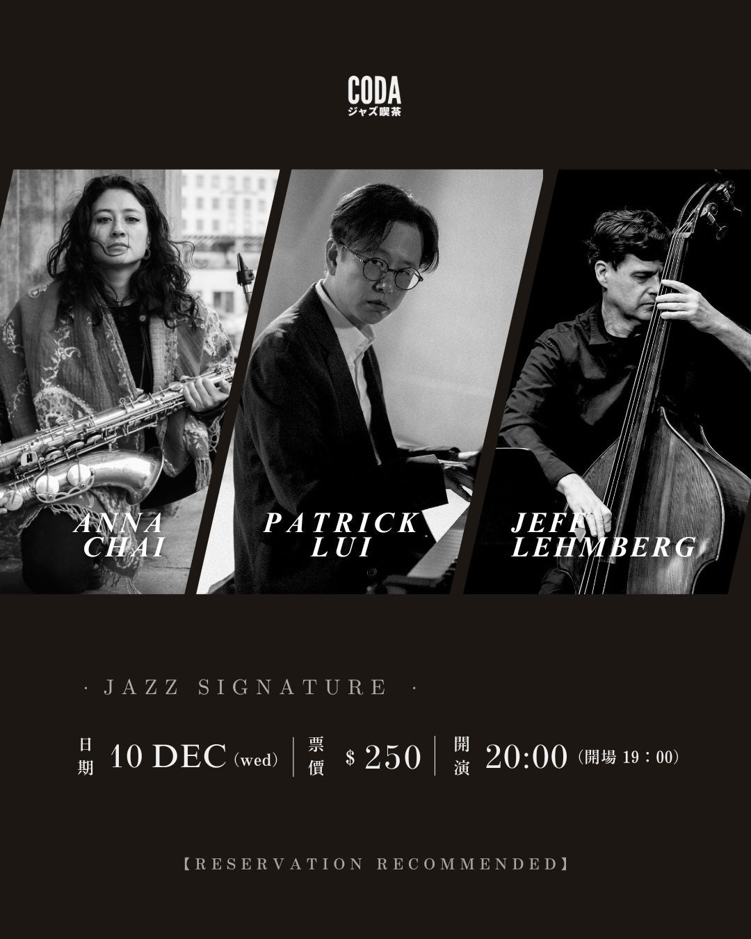 倫敦色士風手 Anna Chai 將與香港獲獎鋼琴家兼作曲家 Patrick Lui 聯手,並由多元的低音提琴手 Jeff Lehmberg 共同演出,於 CODA Jazz Kissa 重新演繹一系列jazz standard。